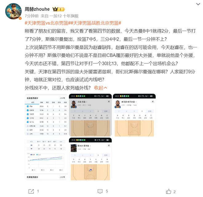 媒體人周赫對北京這場失利非常不滿,他認為末節(jié)該棄用的是8中1的杰曼而非斯佩爾曼,因為末節(jié)天津是用雷諾茲,北京這邊應該讓斯佩爾曼上去限制他的發(fā)揮。