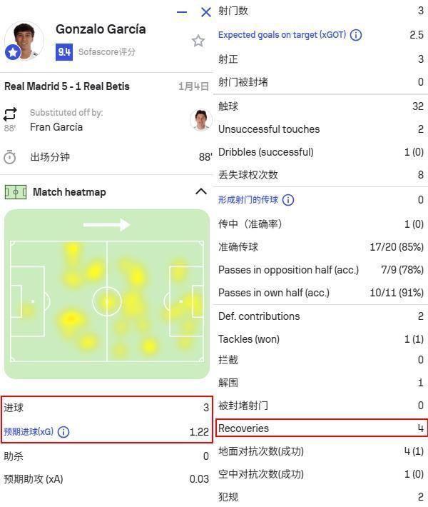 這一點從熱圖上也可以看到,貢薩洛的覆蓋范圍還是很大的??紤]到他不是那種持球型,這個熱圖本身還無法體現(xiàn)出他單場跑動超過11000米的特點。