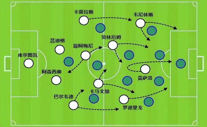 因為貢薩洛的跑動積極性很高,在體能充沛時,他還是很容易找到這樣的機會。與馬競比賽中皇馬的第一個進球,就是貢薩洛做球貝林厄姆,后者推進中制造犯規(guī),巴爾韋德主罰任意球得分。