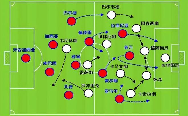首先前鋒回撤本身不是壞事,只是姆巴佩在接球前不愿意為隊友做無球掩護跑,傳球后也缺少及時的二次移動。相比之下,貢薩洛雖然跑動速度遠遠不如姆巴佩,不過他的跑動范圍和習慣很好?;爻分蠼忧騻髑蚝苎杆?,同時也能二次跑位重新回到鋒線頂端。