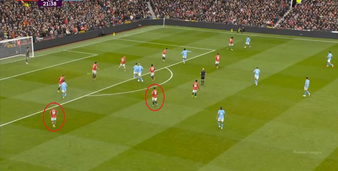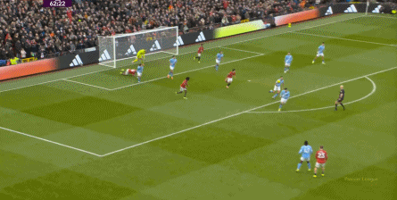 于是在第21分鐘,曼聯(lián)通過搶斷完成快攻,從右路起腳傳中,聯(lián)系到了左路后點的多爾古,打出了本場比賽的第一次威脅進攻: