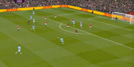 不過在這個時候,曼城也開始在進攻端加碼,一個清晰的特征就是阿克在左側(cè)禁區(qū)角區(qū)域的參與力度越來越大,這是曼聯(lián)難以限制的地方:
