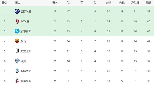 截至目前,國(guó)米在積分榜上,以6分的優(yōu)勢(shì)位居榜首,哪怕接下來(lái)AC米蘭能夠在客場(chǎng)戰(zhàn)勝羅馬,他們也只能繼續(xù)排名第二,暫時(shí)沒(méi)有球隊(duì)能威脅國(guó)米的榜首寶座。事實(shí)上,如果國(guó)米能改善對(duì)陣3大強(qiáng)隊(duì)時(shí)的表現(xiàn),本賽季他們大概率能鎖定聯(lián)賽冠軍。