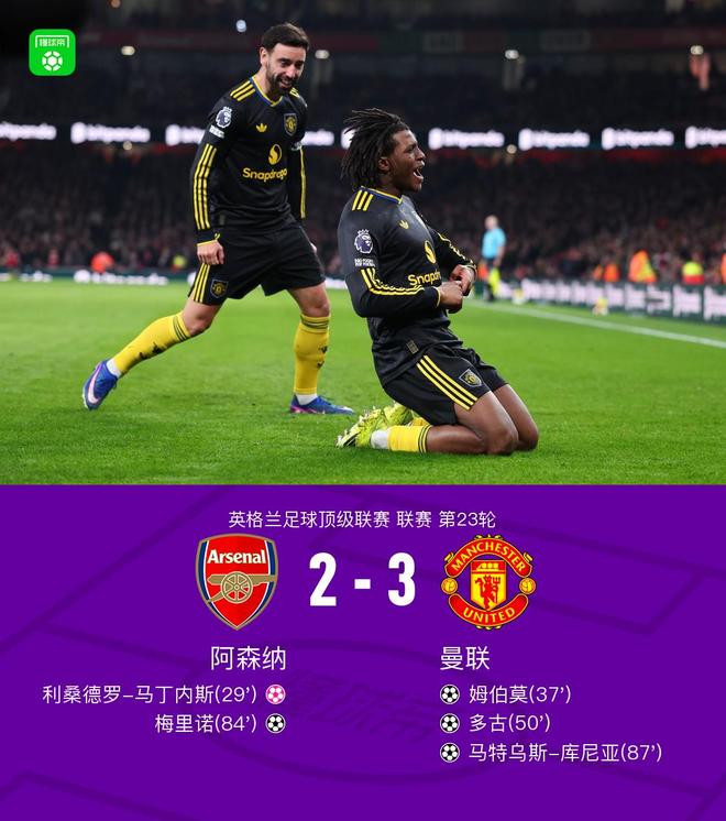 英格蘭足球超級(jí)聯(lián)賽第23輪,阿森納主場對(duì)陣曼聯(lián)。上半場,厄德高制造利馬烏龍。蘇比門迪送出烏龍助攻,姆伯莫扳平比分。下半場,多古轟入無解世界波,梅里諾利用角球機(jī)會(huì)扳平比分。不過,庫尼亞很快再次轟入世界波。全場比賽結(jié)束,曼聯(lián)客場3-2擊敗阿森納,拿下兩連勝。